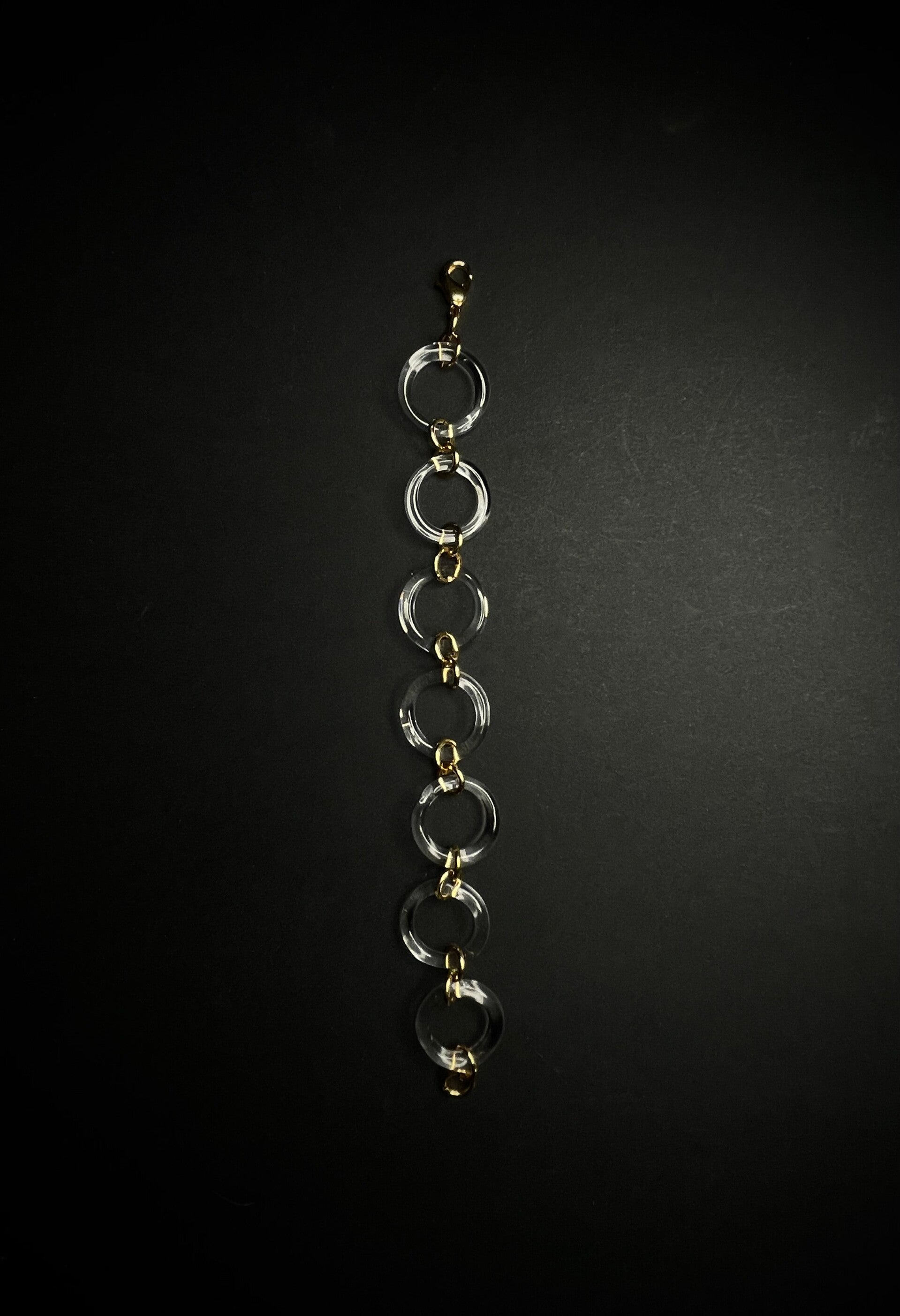 Je travaille le verre au chalumeau. Chaque anneau de verre est réalisé à la main et le bracelet est assemblé par mes soins.
